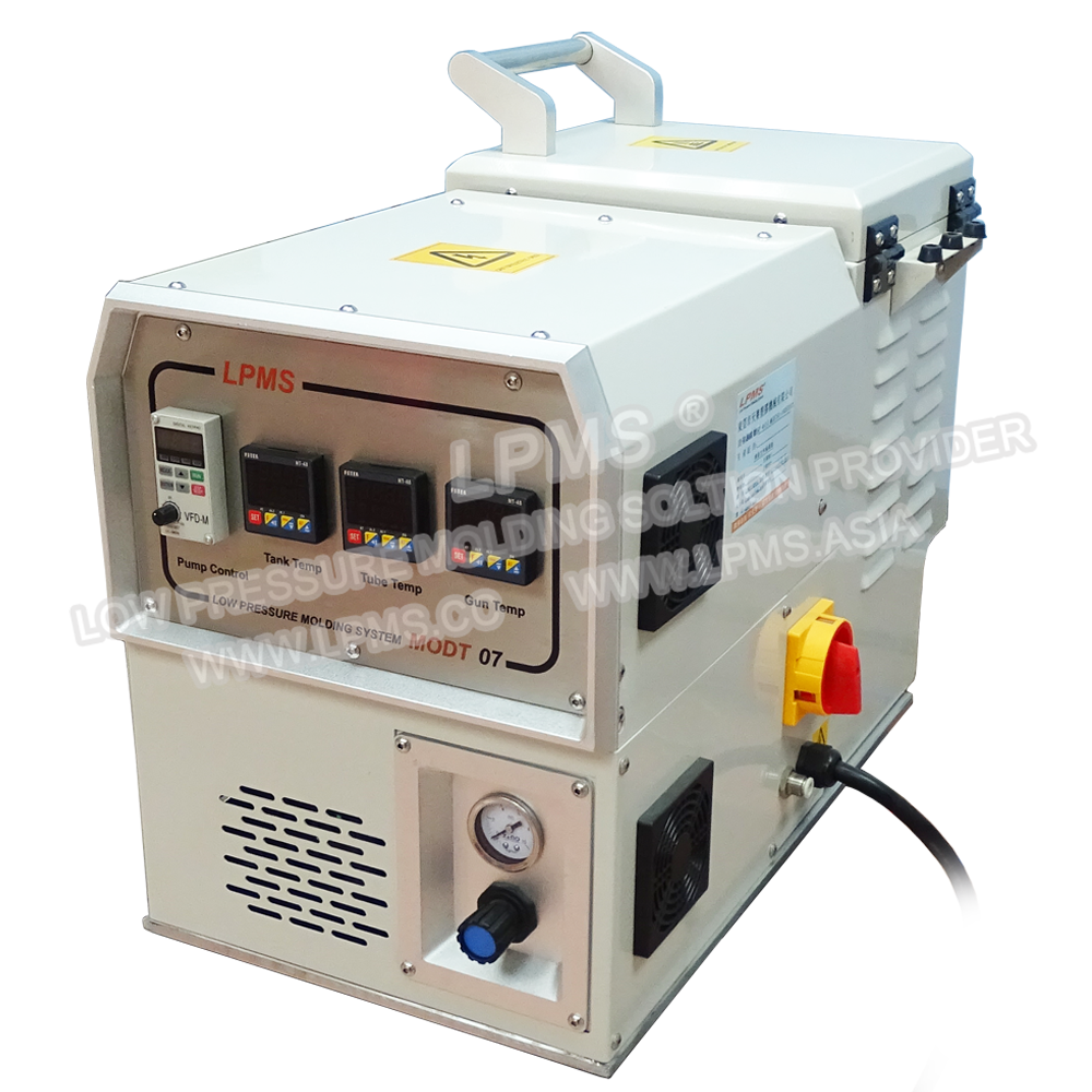 熱熔膠熔膠機是低壓注塑設備的核心部件,有儲膠、輸送膠料、熔化膠料、控制膠量和注膠壓力等功能,使注膠達到穩定的效果,MODT-07系列和LPMS各種類型的低壓注膠工作臺搭配後適用於各式低壓熱熔膠成型樹脂對產品注膠包封,制程壓力低(0-6Mpa),不會損傷零部件,無化學反應,成形快速,冷卻即成型,成型後產品具有絕緣與防水等性能。